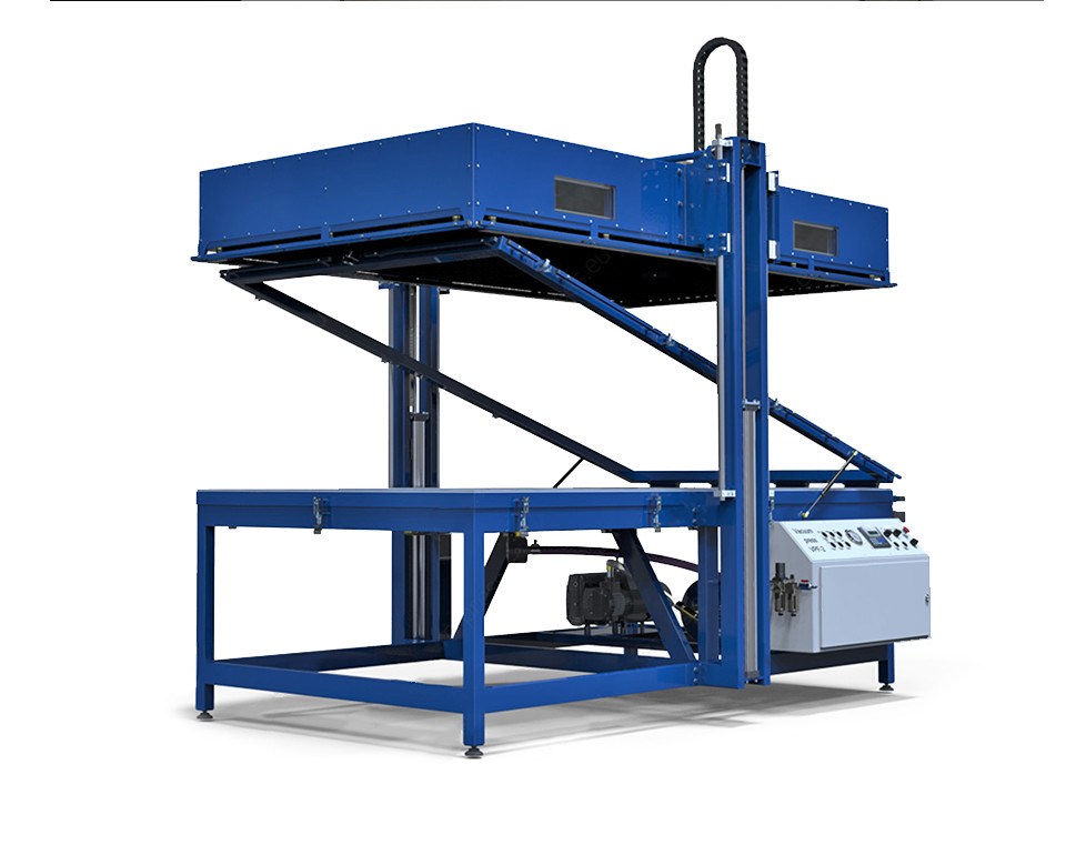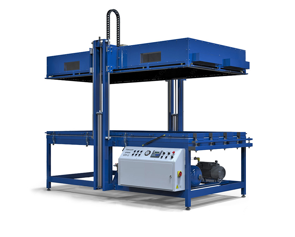 Vakuum-Thermofolie Presse VPF-2-3000 ist für die 3D Ummantelung mit PVC und könnte auch als übliche Vakuumpresse verwendet werden.